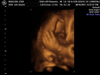 I went in today for an ultrasound and Lexi had moved head down. Hooray! Unfortunately, the rib pain has not gone away and is apparently unrelated to her head being in my ribs (though I'm sure that didn't help). So until this little darling comes out, I guess I'm destined to have aching ribs.